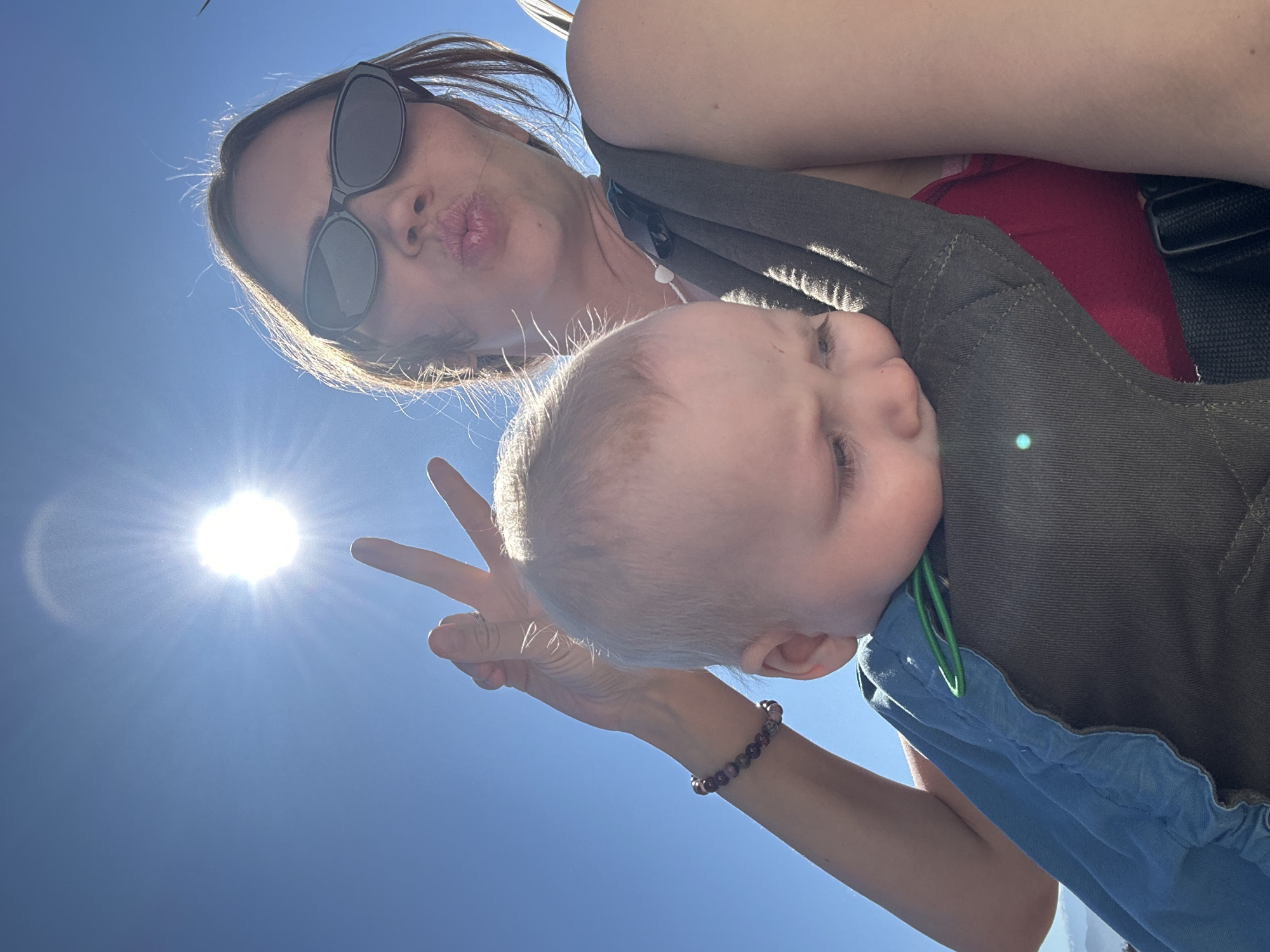 The image depicts a close-up outdoor scene on a bright, sunny day in Fethiye, Turkey. An adult female, with dark hair, wearing dark sunglasses, a red top, and a white beaded necklace, occupies the right side of the frame. Her left hand, adorned with a beaded bracelet, is raised and forms a 'peace' sign, while her lips are pursed in a kissing gesture. An infant with light-colored hair, clad in a blue garment with a green clip attached, rests within a dark grey baby carrier positioned on the female's chest. The infant's face is turned downward or eyes are closed. The background is a clear blue sky featuring a prominent, radiant sun in the upper left quadrant, causing a sunburst effect. A faint, blurred distant landscape is visible in the lower left background.