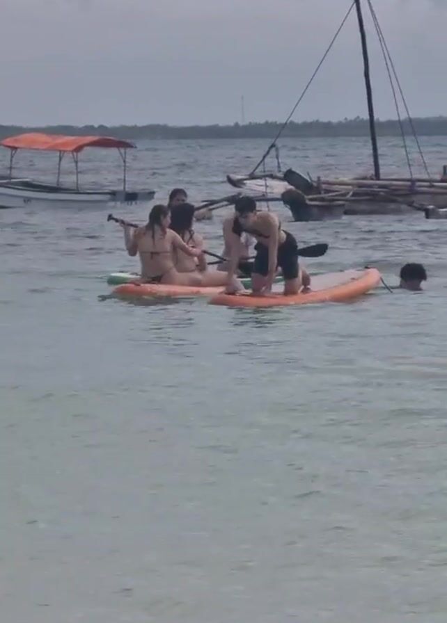 Four women wearing bikinis and one man wearing shorts are on two connected paddleboards in the ocean. The paddleboards are orange and green. The man is kneeling on the orange paddleboard. One of the women is sitting on the orange paddleboard. Two women are sitting on the green paddleboard. One woman on the green paddleboard is using a paddle. A child is swimming in the water near the paddleboards. In the background are several boats, a cloudy sky, and a distant shoreline.