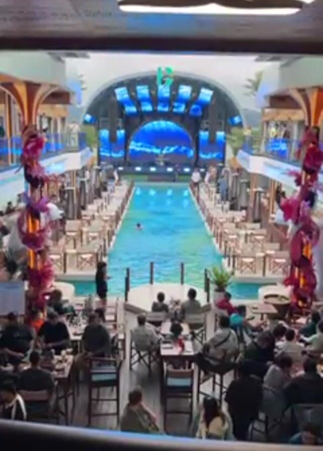interior of a large restaurant that has a swimming pool running down the middle of the dining area. There are tables set up on either side of the pool where people are sitting and eating. Some people are standing around as well, near the bar. At the far end of the pool is a stage area with large screens showing animated ocean scenes. On the second level of the restaurant, people are visible looking down at the scene. The lighting in the restaurant is modern, and the decor includes tall floral arrangements. There appears to be a party or event happening.