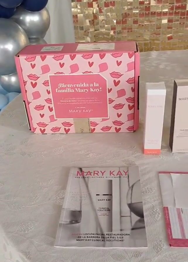 On a table covered with a white lace tablecloth, a variety of Mary Kay products are displayed. To the left of the frame is a blue and silver balloon arrangement. A pink box with the inscription "¡Bienvenida a la familia Mary Kay!" sits prominently on the table. Nearby, a Mary Kay catalog, product boxes, and two pink shopping bags are arranged. The backdrop is a wall covered in reflective silver squares. The scene suggests a Mary Kay promotional event or onboarding.
