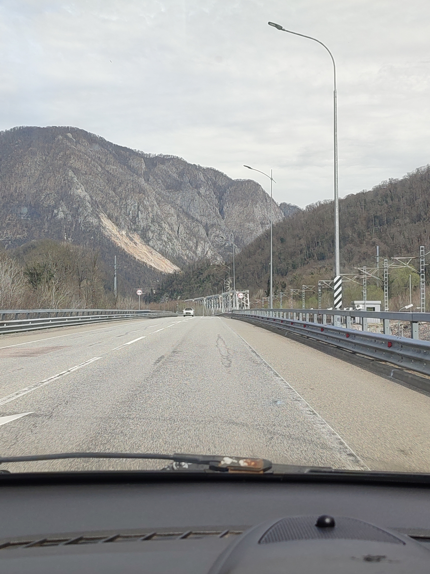 view from inside a vehicle driving on a bridge. A mountain range is visible in the background. The location is Adlerskiy, Russia, as suggested by the context. The road has metal guardrails on either side. Streetlights line the side of the road. A vehicle is visible in the distance driving in the same direction. A railroad track runs parallel to the road on the right side. The sky is overcast. The vehicle's dashboard and windshield wiper are visible at the bottom of the frame.