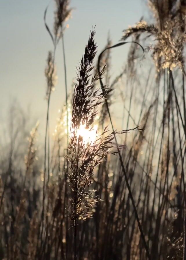 tall, dry reeds against a bright sun in a clear sky. The sun is shining through the reeds, creating a silhouette effect. The reeds are brown and golden in color, and they sway gently in the wind. There are indistinct voices audible.