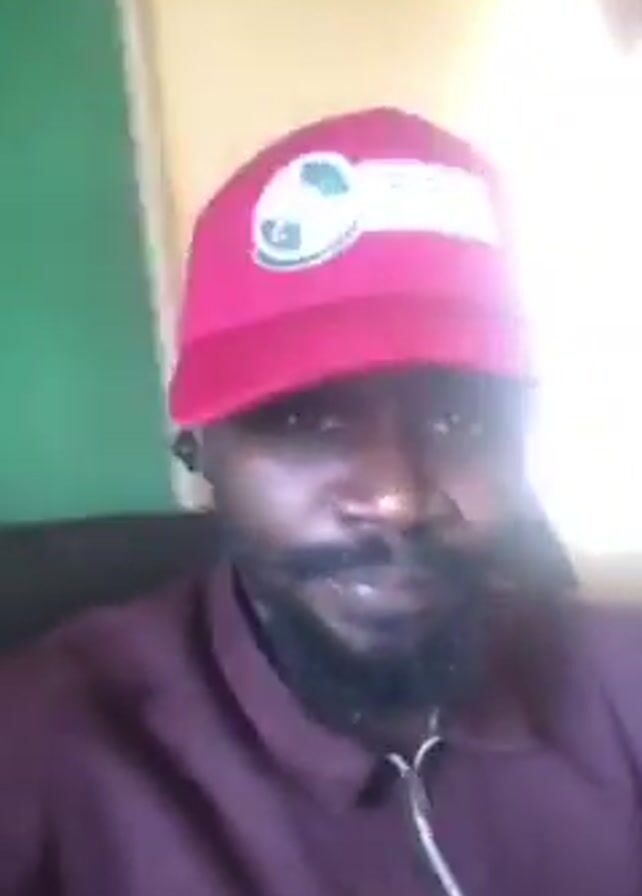 A man is sitting in an office chair. He is wearing a maroon zippered jacket and a red baseball cap with a circular logo on it. He has a beard and mustache. In the background, there is a red wall with papers and posters on it, a black and silver TV, and a small wooden table. The camera is shaking slightly. The man's eyes widen in the middle of the video.