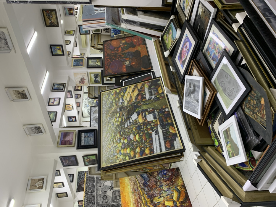 This image depicts the interior of what appears to be an art gallery or framing shop in Ikate, Nigeria