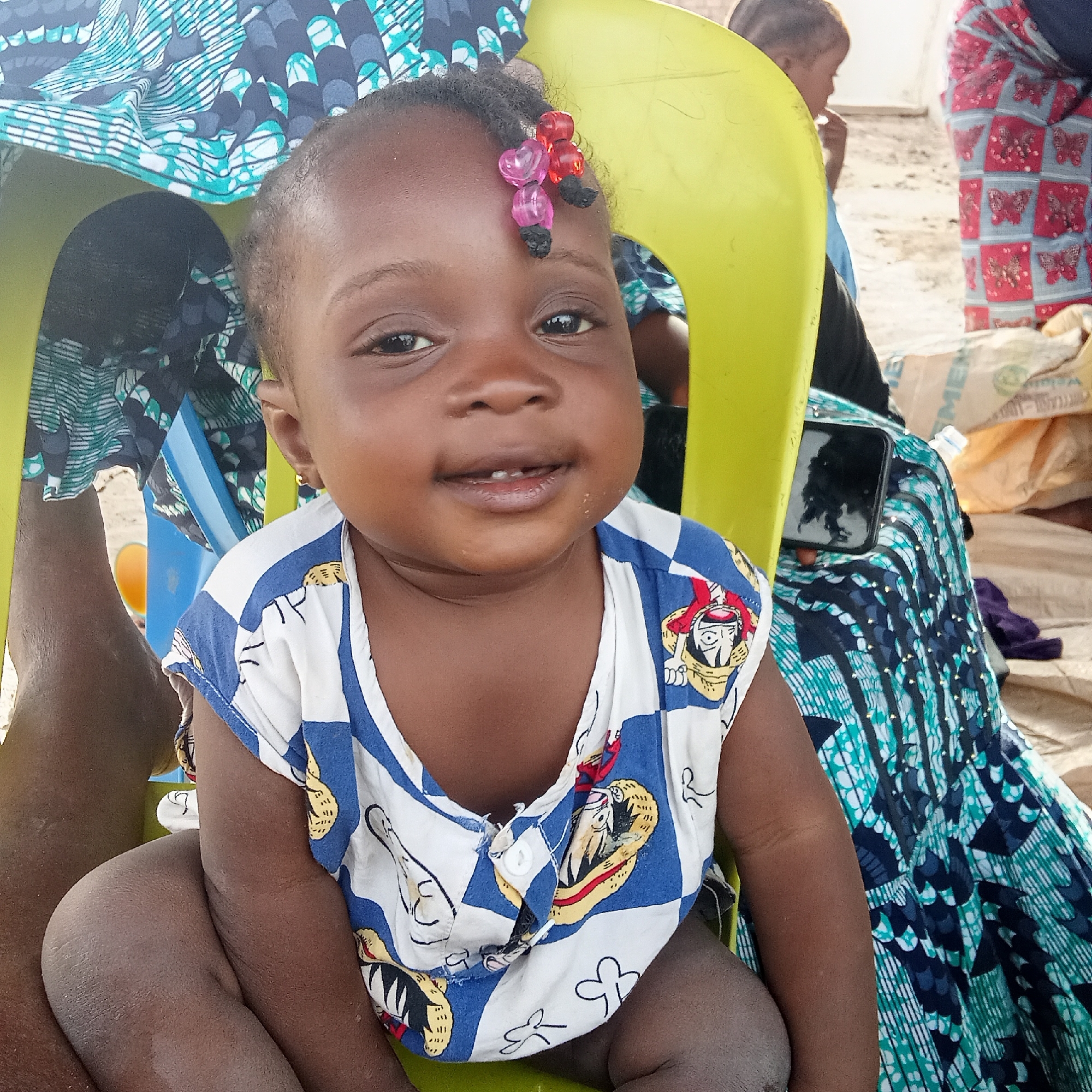 A young child with dark skin and beads in their hair is sitting on a lime-green plastic chair. The child is wearing a white and blue patterned shirt with cartoon character images. In the background, an adult is wearing a colorful, patterned skirt and sitting on another plastic chair. A black cell phone sits on the skirt beside the child. Other individuals and supplies are present in the background. The location appears to be Doma, Nigeria.