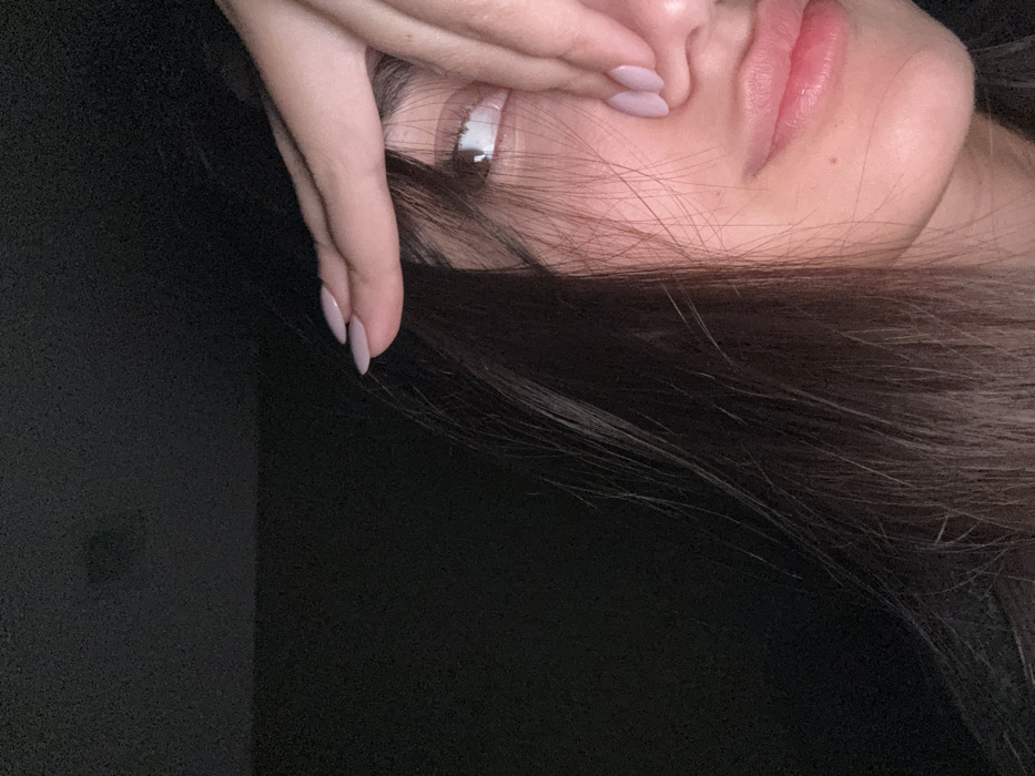 A close-up shot features a person with light skin, brown hair, and manicured nails. Their face is partially obscured by their hand, covering one eye. The visible eye is brown with a bright reflection, drawing attention. The lips are full and pink. The background is a stark black, contrasting with the light skin and highlighting the facial features. The angle is somewhat unusual, presenting the person's face in an upside-down orientation.