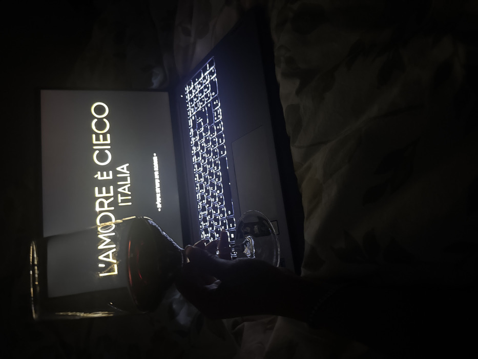 - "A dark image features a laptop displaying the words "L'AMORE È CIECO ITALIA" in golden lettering on its screen" by FM-v1KIi2, licensed under CC BY 4.0