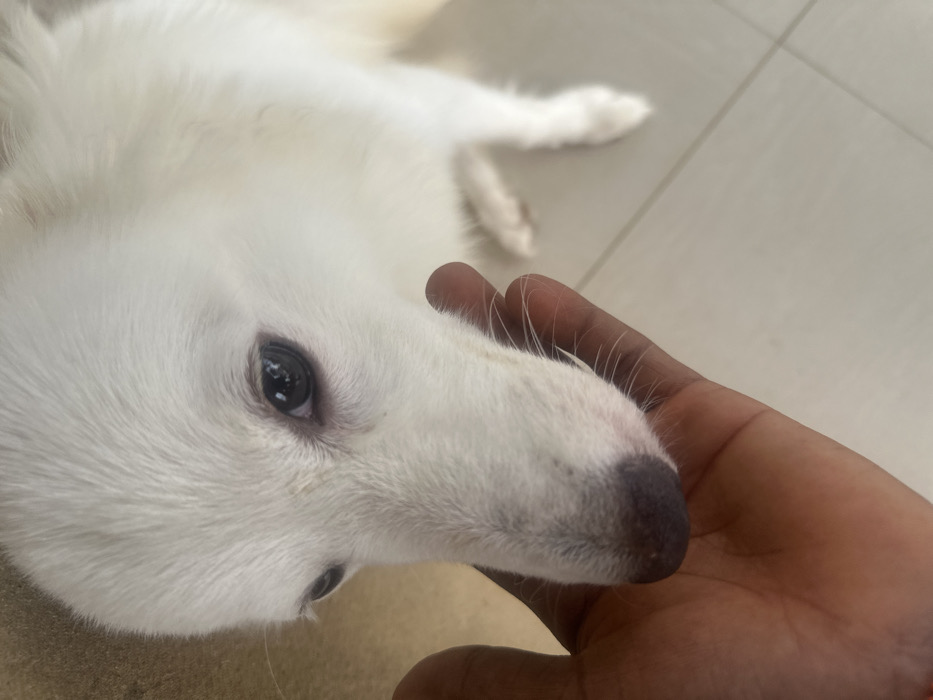 The scene is set indoors in Ikot Ekpene, Nigeria. The primary subjects are a white dog and a human hand. The dog, a fluffy, white-furred canine with dark, round eyes and a dark nose, is positioned with its head angled downwards, looking towards the human hand. Its muzzle and nose are in direct contact with the palm and fingers of a hand exhibiting brown skin pigmentation, suggesting a gentle interaction or petting. The dog's whiskers are clearly visible extending from its snout. In the background, a light-colored, possibly off-white, tiled floor with visible grout lines is present, particularly in the lower right portion of the image. A blurred light-colored surface is also visible in the upper left.