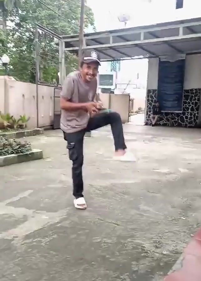 A young man wearing a gray t-shirt, black pants, a baseball cap, and white sandals is the primary focus of the video