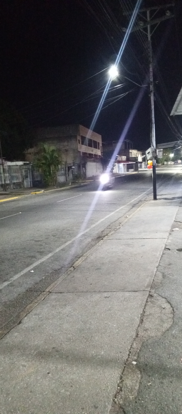 The image depicts an urban street scene at night in Tinaquillo, Venezuela, illuminated primarily by artificial light sources. In the immediate foreground on the right, a concrete sidewalk is visible, exhibiting minor cracks and wear. Adjacent to the sidewalk is an asphalt road with a distinct curb, separated by a worn gutter. The road surface shows some discoloration and minor imperfections, with a faded white line marking a lane boundary. Further into the midground on the right, a tall utility pole constructed of dark material supports a complex network of overhead wires that traverse the frame. A bright, unshielded street light fixture is mounted on this pole, emitting a strong glare and pronounced lens flares that diagonally bisect the upper half of the image. Across the road on the left, a series of structures line the street. A chain-link fence is visible near the roadside, behind which stands a two-story building with multiple rectangular openings on its upper floor, suggesting windows or balconies, and a weathered facade. Next to it, a smaller building appears partially dilapidated or under construction. A small palm tree with green fronds is situated between these structures. Yellow painted curb markings are present on the left side of the road. A vehicle with intensely bright headlights is positioned centrally in the midground, moving towards the viewer on the asphalt road. The vehicle's make and model are obscured by the headlight glare. The background reveals further indistinct urban structures and additional distant artificial lights, suggesting a populated area. The sky above is dark, indicating nighttime conditions. No individuals are visible in the frame.