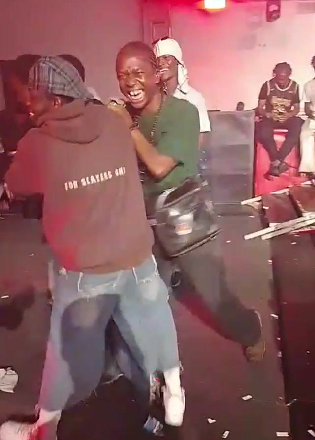 crowd of people dancing in what appears to be a nightclub or party venue. There's red lighting illuminating the scene. Some people are laughing and appear to be having fun. Most individuals are casually dressed. The environment includes sound equipment and what looks like structural supports overhead. The floor seems to be covered with trash, and there's a bottle of water on the ground near a platform. People are moving, dancing, and interacting within the crowded space.