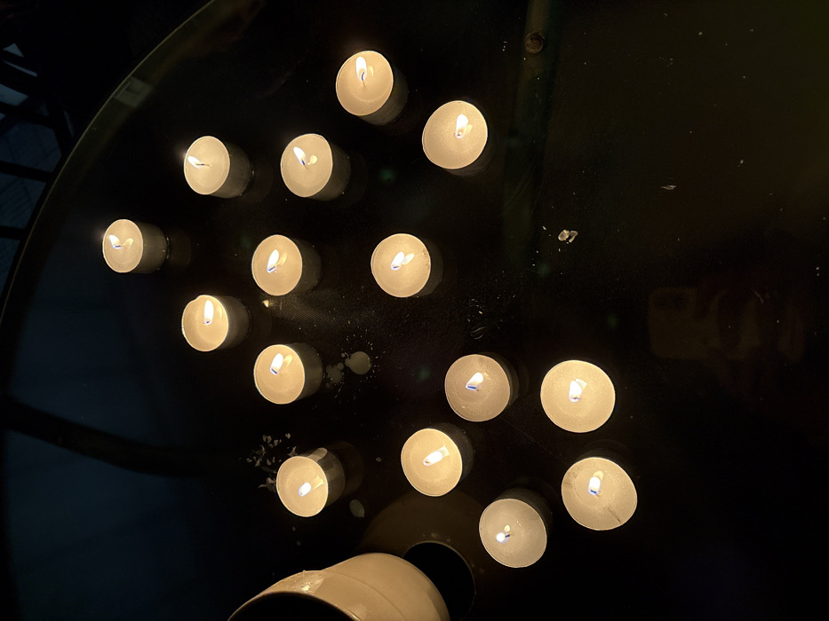 - "A dimly lit, slightly angled shot reveals a dark, reflective surface adorned with numerous small, glowing candles arranged in a seemingly random pattern" by FM-E1hwL2, licensed under CC BY 4.0