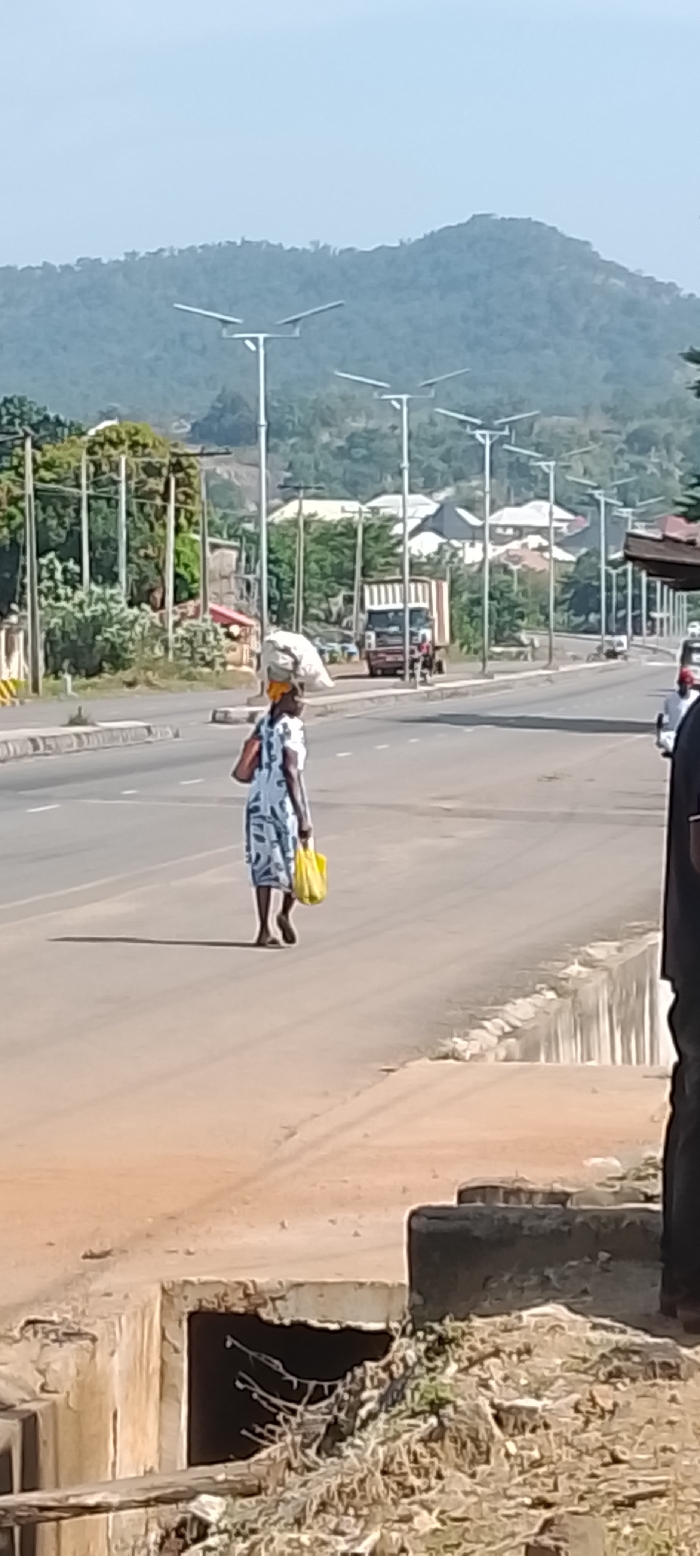 The image displays a daytime scene on a paved road in Lokoja, Nigeria. An adult female is visible in the midground, walking barefoot from left to right across the roadway. She wears a patterned, light-colored dress and a yellow headwrap, balancing a large, light-colored bundle on her head. She carries a brown shoulder bag on her left side and a yellow plastic bag in her right hand, casting a discernible shadow behind her. In the immediate foreground on the right, the lower torso of a dark-clad individual is partially visible, facing right. Below this individual, a concrete structure, likely a drainage channel or curb, shows signs of damage and contains a dark, square opening. Sparse vegetation and debris are present around this structure. The road features multiple lanes and appears to have a central reservation, marked by white lines. Modern street lights, each equipped with solar panels, are prominently positioned along the road, extending into the distance on both sides. In the mid-background, buildings and dense green vegetation line the roadway. A large, dark-colored truck is visible on the right side of the road further back, and other vehicles are indistinctly seen in the distance. The far background is characterized by a range of prominent, vegetated hills under a clear, light blue sky. The lighting indicates bright sunlight.