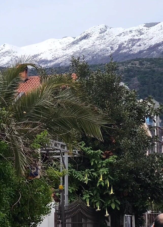 The video presents a street view featuring lush greenery and snow-capped mountains in the background. Several trees, including palm trees and flowering bushes, frame the scene. Buildings of varying heights and architectural styles line the street, including what appears to be an apartment complex under construction. Pedestrians stroll down the street, engaging in conversations and observing the scenery. The overcast sky suggests a cloudy day. The overall impression is one of a serene and vibrant neighborhood nestled against a stunning mountainous backdrop.
