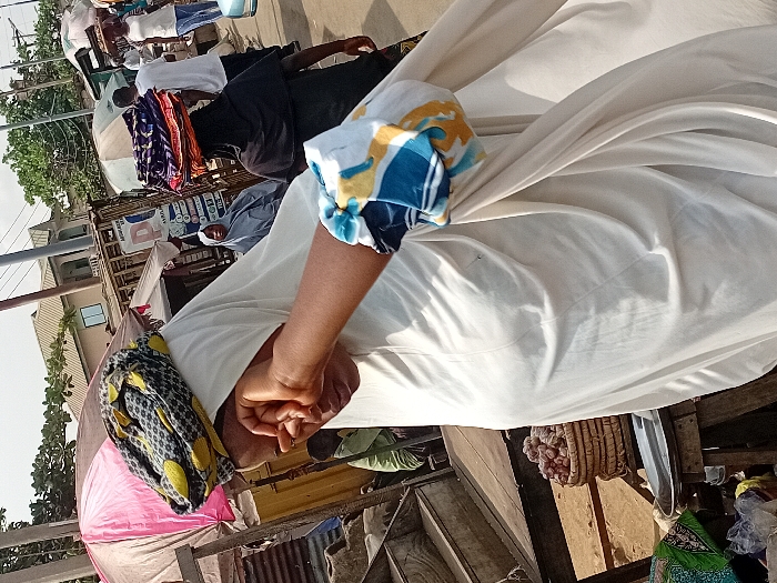 A person wearing a white garment and a patterned headscarf stands in an outdoor market