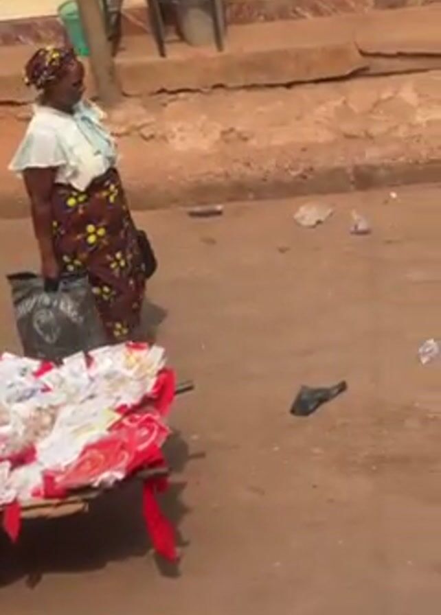 A woman in a patterned head wrap, white blouse, and floral patterned skirt is standing on a street with a black shopping bag in her left hand, looking towards a table covered in assorted items under plastic