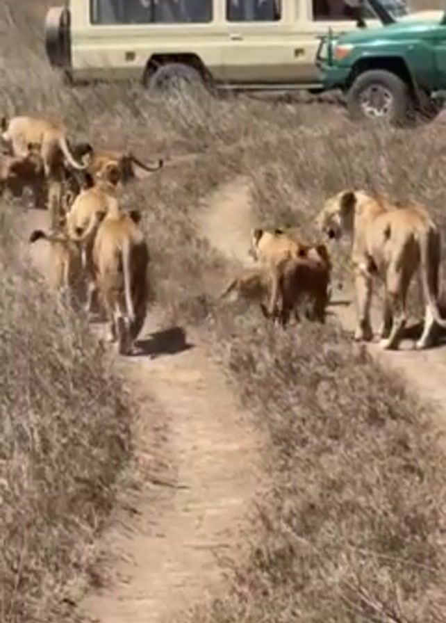 A group of lions, including cubs, is walking along a sandy path in a grassy field. Two safari vehicles are parked nearby, one light tan and the other green. People are visible on the roof of the tan vehicle. The lions are moving away from the vehicles, with some cubs playfully running alongside the adults. The environment appears dry and sunny.