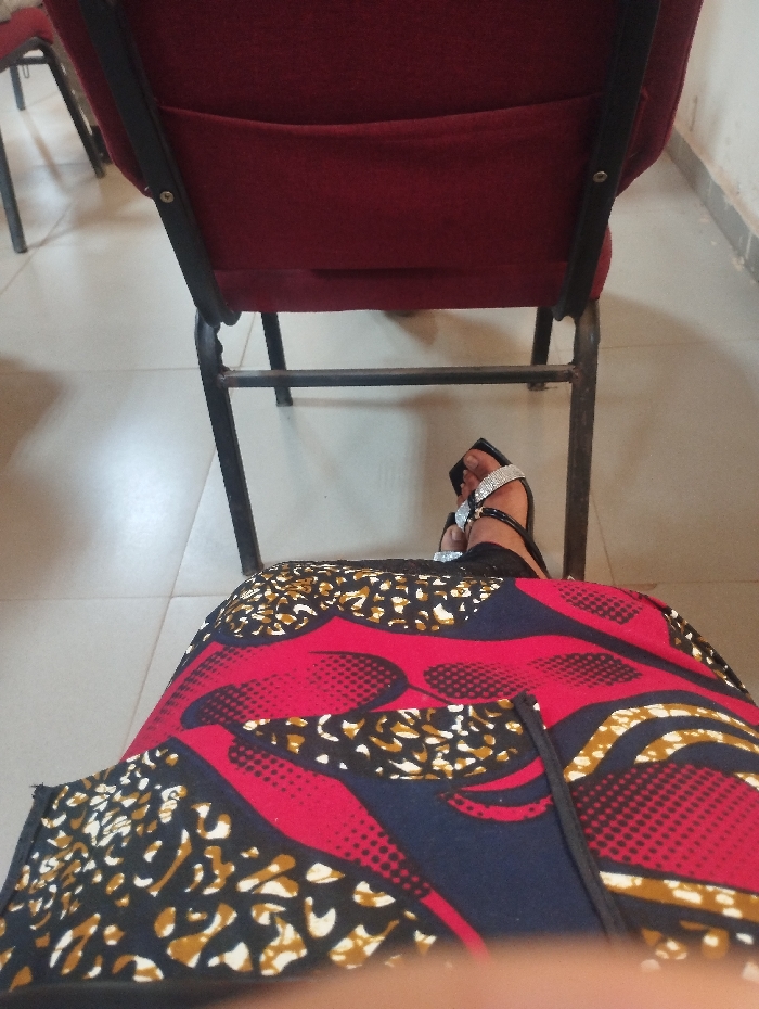 The image presents an indoor scene from a low, seated perspective. In the foreground, a person's lap is visible, covered by fabric featuring a bold pattern of black, red with black dots, and organic shapes in gold, white, and black, consistent with African print textiles. A bare foot, adorned with a black sandal featuring a wide, silver-colored, rhinestone-studded strap across the toes, extends into the lower center, resting on a light-colored, possibly cream or beige, tiled floor composed of square tiles. Directly ahead, the rear of a dark red upholstered chair with a black metal frame occupies the central upper portion of the frame. The lower section of its backrest and the support bars for the seat are visible. A similar chair is partially visible on the far left. A plain, light-colored wall, likely white or off-white, is visible on the right side of the frame, showing some minor vertical marks or discoloration near its base. The specific location within Barden Yana, Nigeria, is not discernible from the visual evidence, but the scene is characteristic of an indoor public or private building within the region.