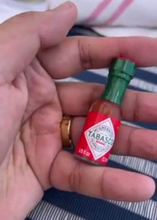 hand holding a miniature bottle of Tabasco brand pepper sauce