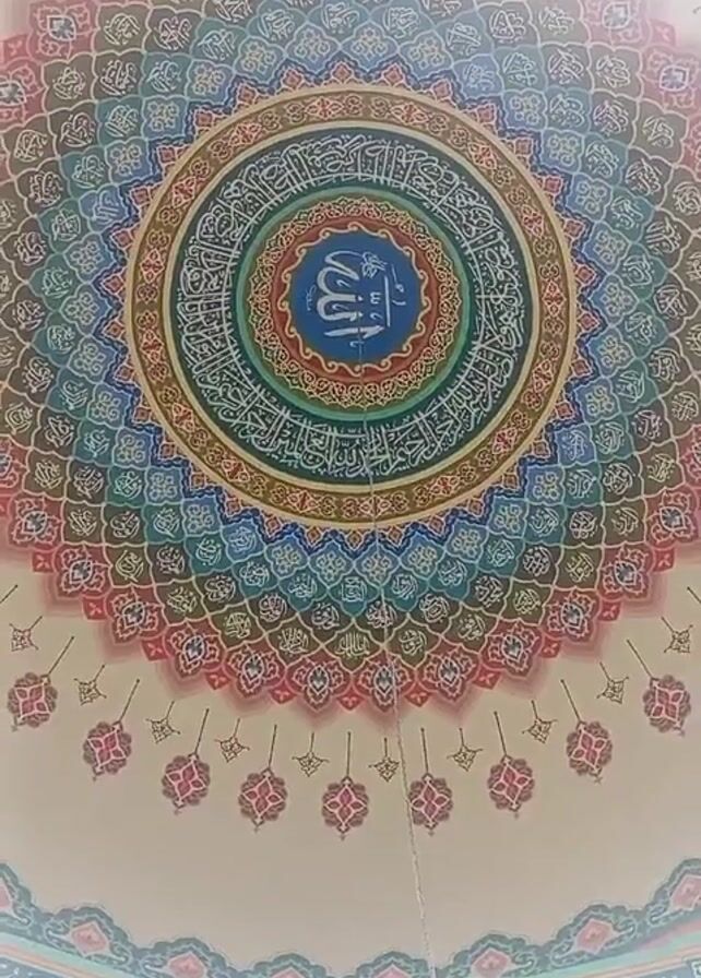 low angle view of a mosque's dome. The dome has intricate, circular patterns in shades of blue, green, pink, and brown. Arabic script is prominently featured in the center, surrounded by concentric circles. There are repeating floral motifs around the edges of the dome.