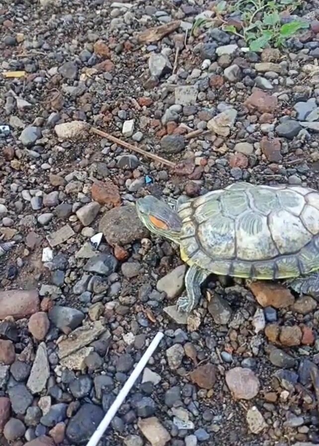 red-eared slider turtle on a ground covered with small rocks and debris, including a white plastic straw. The turtle appears to be stationary. The surrounding environment consists of the rocky ground with sparse green vegetation visible in the upper left corner.