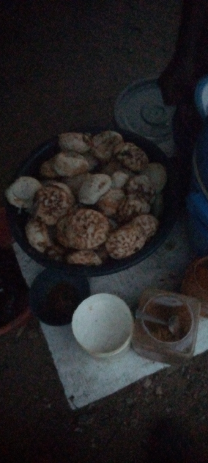 The scene, located in Adankolo, Nigeria, depicts a collection of food items and various containers situated on a light-colored surface over darker ground, under low light conditions. A large, dark circular basin is centrally positioned, filled with numerous irregularly shaped, light-colored baked or fried dough items, many exhibiting reddish-brown patterned surfaces. To the lower left of the large basin, a smaller dark-colored bowl contains a dark granular substance. Adjacent to it on the right, a white, empty bowl is present. Further to the right, a clear plastic container with a lid holds a reddish-brown granular substance and a small spoon. In the upper right background, a metallic lid with a concentric spiral design is partially visible, alongside a segment of a blue container. No individuals are visible, and no actions are explicitly depicted.
