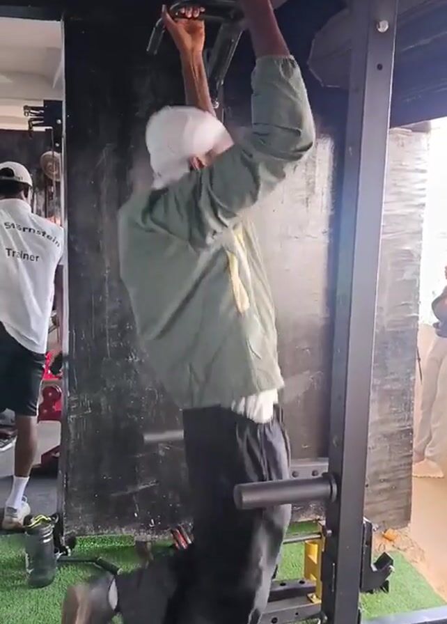 A person wearing a green jacket and white cap is attempting a pull-up on a black pull-up bar. The person struggles, and after one pull-up, steps down onto a platform below. The person then smiles and gestures. The pull-up station is in a gym with green artificial turf. A person wearing a "Hornstein Trainer" shirt is in the background. Other gym equipment and people are partially visible.