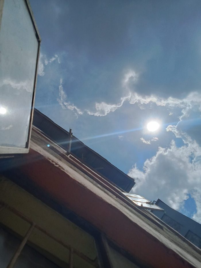 This image captures an upward-angled view of a building exterior under a partly cloudy sky in the city of Unknown, Unknown. The scene is illuminated by direct sunlight, with the sun prominently visible in the upper right quadrant, casting significant lens flares across the frame. In the immediate foreground on the left, a rectangular, reflective surface, likely a window pane or mirror, shows bright reflections of the sun and clouds. A dark frame outlines its left edge. Below the sky, the upper part of a building's facade is visible. It features a horizontal reddish-brown band, possibly a concrete beam or fascia, positioned above a lighter-toned wall section. Beneath this, the top portion of a window with dark vertical grilles is discernable. Further back and slightly higher, the dark-sloping roofline of another building is visible against the sky. A thin, vertical metallic structure, potentially an antenna or support rod, extends upward near the roof's edge. The sky is a clear blue, with scattered white cumulus clouds occupying approximately half of the upper frame. No individuals or discernible actions are present. The strong sun indicates daytime conditions.