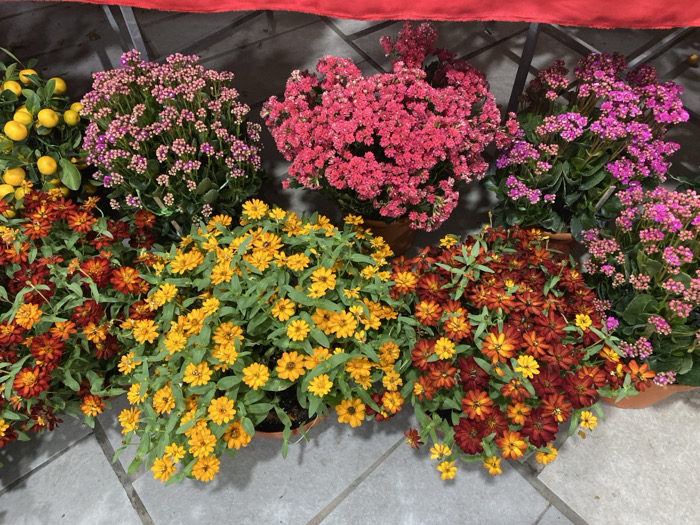 The image displays a vibrant collection of potted plants and flowers, arranged closely together, at an unspecified location within Singapore, Singapore. The foreground features a light gray tiled floor with visible grout lines. On the left, a bushy plant with numerous small, spherical yellow-orange citrus fruits, consistent with kumquats, is present. Adjacent to this, and across the upper half of the image, are multiple pots filled with dense clusters of small flowers in shades of pink, magenta, and fuchsia, likely Kalanchoe varieties. The lower section of the display is dominated by potted plants bearing numerous small, daisy-like flowers. These include plants with bright yellow flowers on the lower left and center, and plants with red and orange flowers in the lower mid-ground and right. The background is dark and appears to be a wall or structure, with a horizontal red band visible at the very top of the frame, suggesting an overhead awning or banner. No individuals are visible.