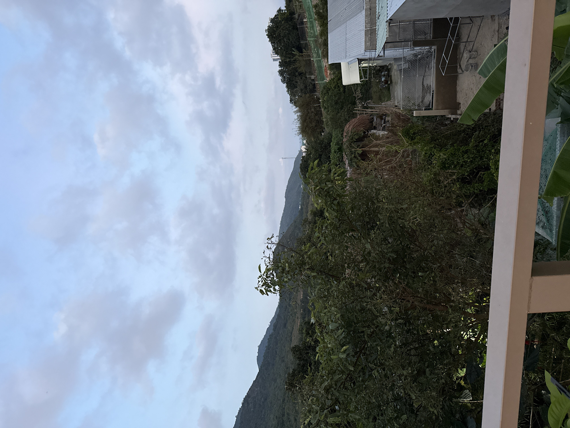 landscape with a mountain range under a cloudy sky. In the midground, there is lush greenery and trees. A building with a corrugated metal roof is partially visible on the right. In the foreground, part of a white railing is seen, suggesting the viewpoint is from a balcony. There is a tower atop the mountain range. Based on the general appearance of the vegetation and the reference to Nha Trang, Vietnam, the environment suggests a location in Southeast Asia with mountainous terrain.