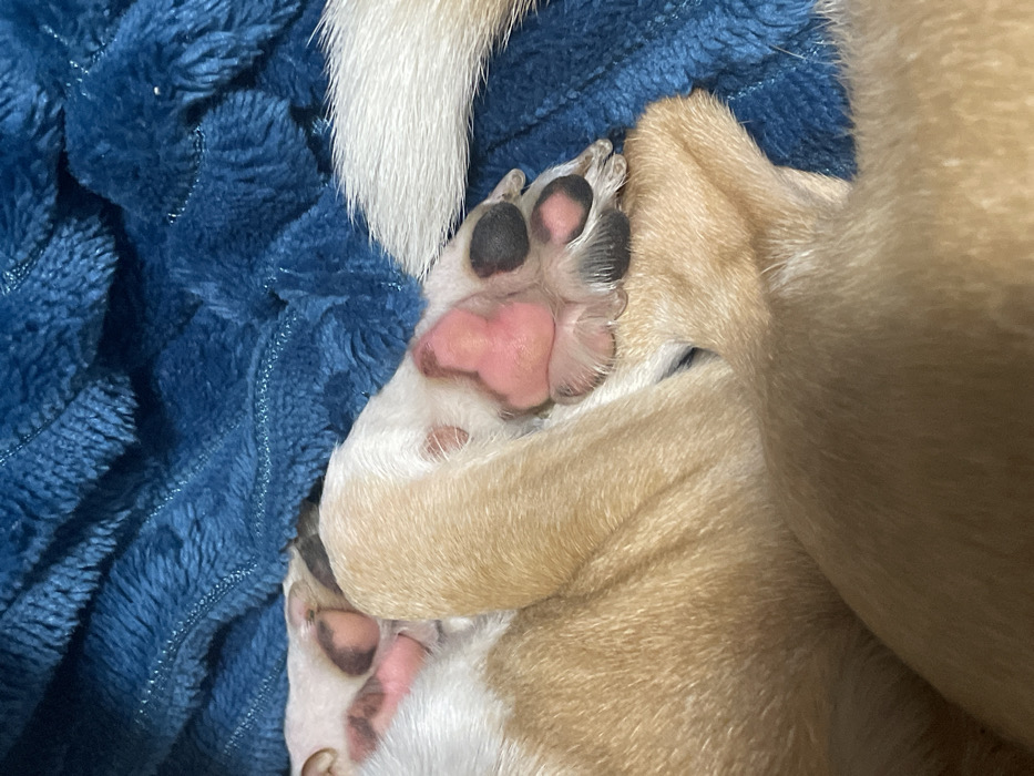 A close-up shows a puppy sleeping on a blue, plush blanket. The focus is on the puppy's paws, which are pink and black. The puppy's fur is a mix of tan and white. The paws are curled inwards, towards the puppy's body, and appear soft and delicate. The blanket is textured, providing a contrasting backdrop to the smooth fur of the puppy. The overall image is warm and comforting, capturing a moment of peaceful rest.