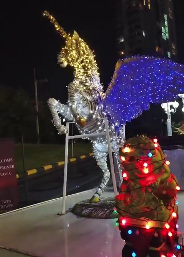 The scene is an outdoor nighttime shot of a holiday display. The focal point is a large, illuminated sculpture of a winged unicorn. Its body is primarily silver with white lights. The head and horn are adorned with warm, golden-colored lights, and the wings are lit with blue lights. Adjacent to the unicorn, on the right side of the frame, is a smaller, gilded statue of a lion-like figure, wrapped in a string of multi-colored Christmas lights. In the background, a tall building is visible, with lights illuminating its many windows. A sign that says "Welcome Foreigner Quota Twin Tower" is seen to the left. The statues are placed on a white platform, with what appears to be a parking area behind them. The camera remains relatively static, offering a straightforward view of the holiday decorations.