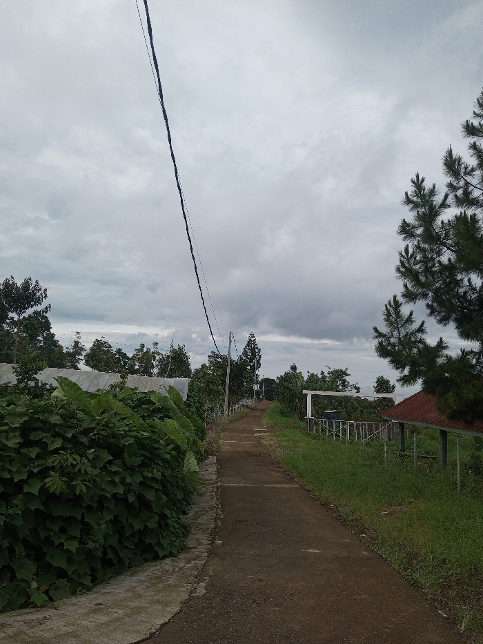 The scene depicts a narrow, unpaved road or pathway in Abbireddygudem, India, under an overcast sky with dense grey clouds. The path, composed of dark brown earth, extends into the distance, ascending and curving slightly to the left. On the left side, a concrete border separates the path from a thick growth of large-leafed green vegetation, behind which a white or light-colored structure, possibly an agricultural shelter, is partially visible. Further back on the left, numerous trees with green foliage are present. On the right side of the path, green grass and weeds grow alongside. A structure with a reddish-brown corrugated roof is visible on the right, partially obscured by a white metal frame. A large pine tree with dark green needles occupies the upper right portion of the frame. A single dark utility cable stretches diagonally across the sky from the upper left to the mid-right, supported by utility poles visible along the path. No individuals or animals are present.