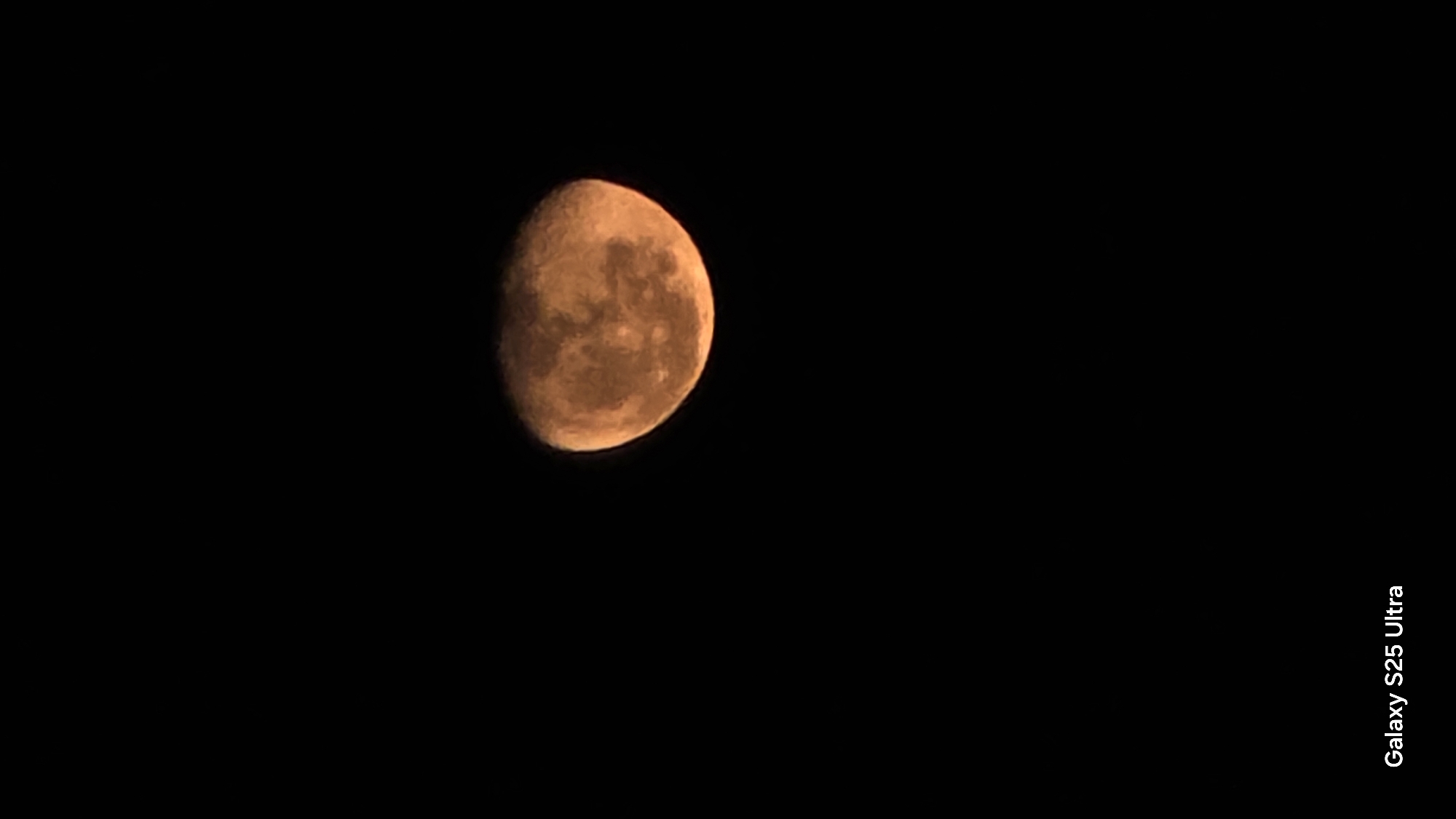 A half-moon, primarily orange in color, is set against a stark black sky. The moon shows visible texture across its surface. In the lower right corner, the text "Galaxy S25 Ultra" is printed vertically. The location is not discernible from the image. There are no people, actions, or interactions visible.