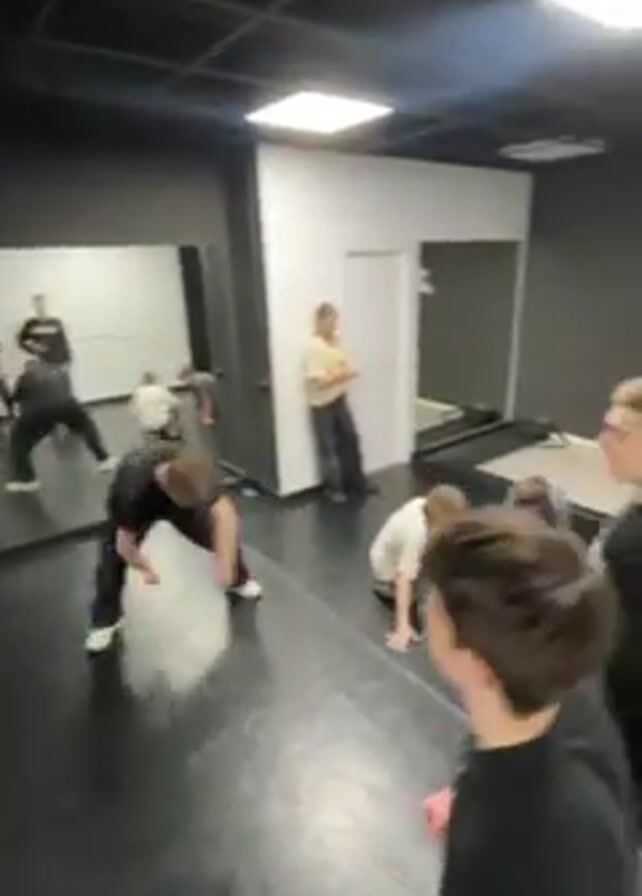 In a modern dance studio, a young man practices a choreographed dance routine. The studio has a black floor, a large mirror along one wall, and a white wall opposite it. The ceiling is black with recessed lighting. Several other people stand in the background, some watching, others on their phones, and a few rehearsing separate moves. The video cuts to a different space with a padded floor, where three young men are practicing a stunt. Two men are holding another upside down.