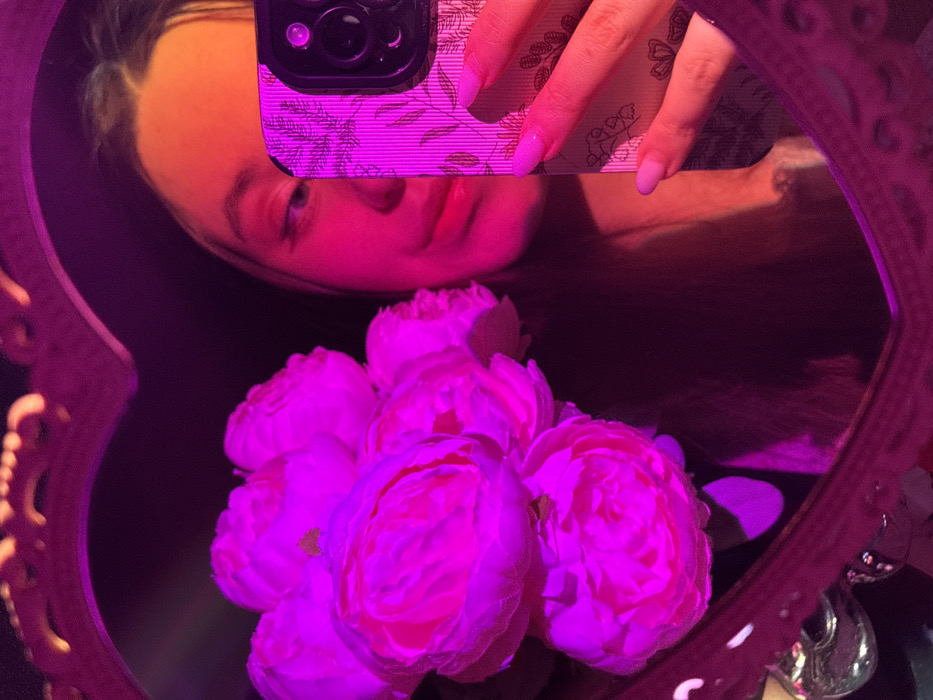 The image displays a mirror selfie captured within a heart-shaped, ornate mirror. The reflected scene features a bouquet of several large, vibrant pink flowers, likely peonies or garden roses, positioned prominently in the left half of the frame. To the right, a female individual's face is partially visible, obscured by a smartphone she holds up to take the photograph. Her right eye, forehead, and the upper part of her nose and lips are discernible. Her right hand, featuring light pink manicured nails, holds a smartphone encased in a patterned cover displaying botanical motifs, with the camera array visible at the top right. The lighting throughout the scene is artificial, dominated by strong pink and magenta hues illuminating the flowers and phone, with orange and red tones on the individual's face, set against a dark, indistinct background. No discernible visual information in the image allows for the identification of a specific location within the city of Krasnodar, Russia, or any other specific geographical area.