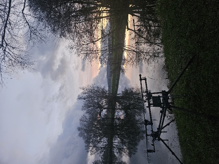 The image displays an outdoor scene at either dusk or dawn in Gavisse, France. In the immediate foreground, a black, three-legged rod pod with two fishing rods and bite alarms is positioned on a patch of green grass, extending slightly over the edge of a body of water. The midground consists of a still body of water, likely a lake or wide river, which accurately reflects the overhead sky and distant trees. The water's surface exhibits a mix of dark grey and faint pink-orange hues from the sky. The opposite bank is lined with numerous bare deciduous trees, their silhouettes and reflections prominent in the water. The sky above is largely overcast with grey clouds, featuring a distinct band of orange and pink light on the horizon towards the right, indicating either sunrise or sunset. Bare tree branches are visible against the sky in the upper portions of the frame. No individuals are present in the scene.