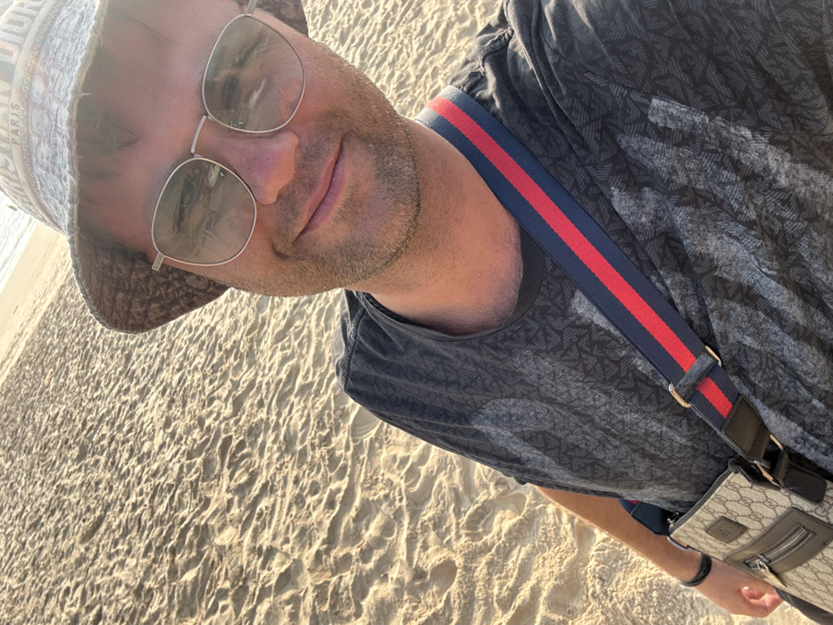 A male subject is depicted in a selfie on a sandy beach, identified as being in the city of Bhagatwadi, India. The subject, an adult male with light stubble and short brown hair, is wearing a patterned grey-brown bucket hat with "CHRISTIAN DIOR PARIS" partially visible, silver-framed sunglasses reflecting the environment, and a dark grey t-shirt with a subtle repeating pattern. A beige shoulder bag, featuring a repeating logo pattern resembling the Gucci GG monogram, is slung across his body with a navy and red striped strap. A dark wristband is visible on his left wrist. He is smiling and looking directly at the camera. The background consists of light-colored sand with ripples and subtle footprints. The ocean is visible in the upper right portion of the frame. Lighting suggests daytime conditions.