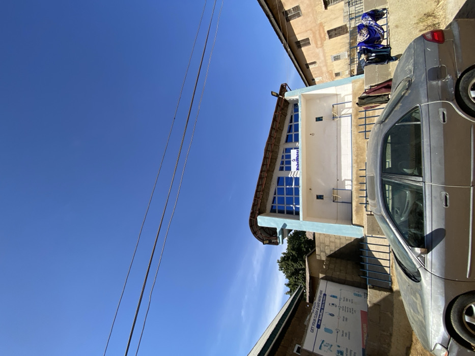 The scene depicts an outdoor street view on Rukuba Road, Nigeria, under a clear blue sky with two visible overhead power lines. In the immediate foreground, the right side of a gray four-door sedan, possibly a Honda Accord, is parked, appearing dusty. The car faces left, partially obstructing the view of the structures behind a low concrete wall topped with a blue metal fence. To the left of the central view, a white signboard with blue text and illustrations, titled "GET YOUR CLEAN & SAFE WATER HERE," stands angled, detailing a water purification process. Behind the signboard and fence, a light brown building with a green-trimmed roof is partially visible. The central feature is a modern-looking, two-story structure with a white lower facade and prominent light blue structural elements. The upper floor features numerous blue-tinted windows arranged at varying angles and a sign reading "KubeWater" in blue text on a white background. The roof is curved and overhanging, possibly constructed of metal sheeting. Two small air conditioning units are mounted on the white wall of the lower floor. To the right of the central building, an older, multi-story structure with a faded orange-brown facade and numerous small, dark-recessed windows is visible. Several items of clothing, including a blue and white patterned fabric and darker garments, are draped over the blue metal fence in front of this older building, suggesting they are drying. Green foliage is visible between the buildings in the background. No individuals are present in the frame.