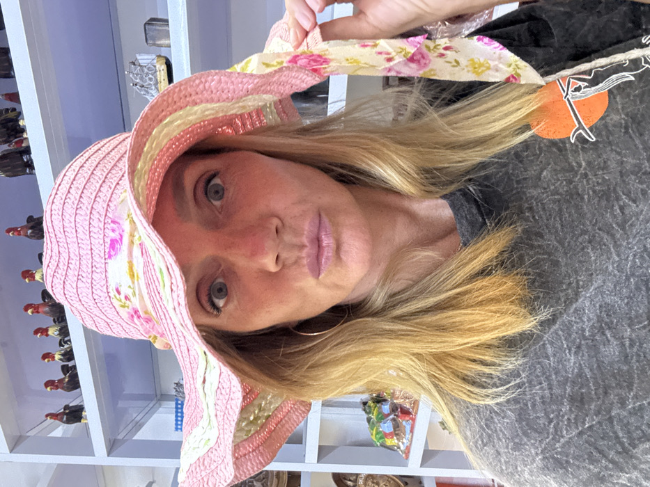 An adult Caucasian woman is shown in a portrait, looking directly at the camera with wide-open, light-colored eyes and pursed lips enhanced with a light pink product. Her long, blonde hair frames her face. She wears a wide-brimmed, light pink straw hat adorned with a floral ribbon band featuring pink, yellow, and green patterns on a cream background. The hat's brim also incorporates alternating light pink and cream woven stripes. A gold-colored hoop earring is visible on her left ear. Her attire consists of a dark grey, possibly distressed, short-sleeved t-shirt, which displays a circular orange graphic design with a white silhouette of a figure on her left chest area. Her right hand is partially visible, holding a trailing section of the hat's floral ribbon. The background features light blue shelving. The top shelf holds a row of approximately seven ceramic rooster figurines. Other decorative objects are partially visible on lower shelves. The scene is situated in Pasay, Philippines.