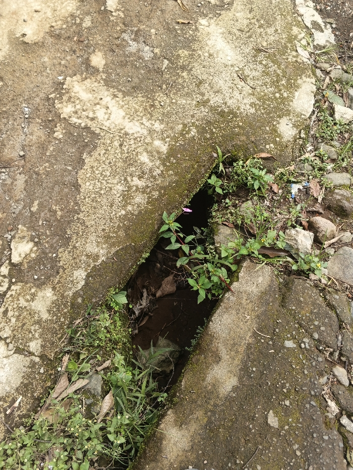A narrow concrete drain runs between two slabs, choked with vegetation