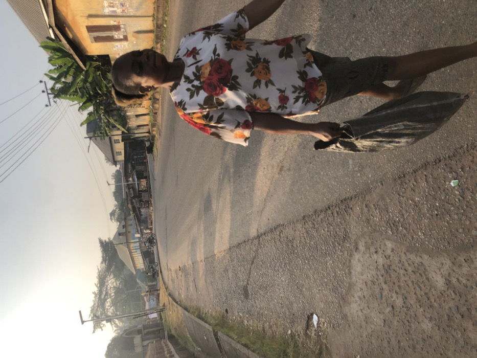 A person stands on a paved road. They wear a floral shirt and shorts, and carry a dark bag. A building sits to the left with a line of shops and trees stretching into the distance. Power lines hang above the road. The sky is pale. A raised grassy curb runs along the road's edge.