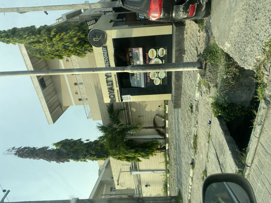 The image depicts a street scene in Ilado, Nigeria, featuring a multi-story building housing a commercial establishment, alongside roadside infrastructure and vegetation. In the mid-ground, a light-colored, multi-story building, possibly beige or cream, presents a flat roof and multiple balconies with white railings on its upper levels. The ground floor accommodates "ROYALTY CONFECTIONERY," marked by a black sign with white lettering and a circular "RC" logo. Adjacent to the main entrance, a standalone kiosk-style structure, framed in a light yellowish-beige and featuring black display panels, is also part of the confectionery. This kiosk displays baked goods behind glass cases and advertises "Our Special Bread" with images of various bread types. Contact numbers, 08102722464 and 09161694339, are visible on a sign near the confectionery. To the left of the building, a light-colored concrete fence topped with what appears to be security wiring (either barbed or electric) extends horizontally. Behind this fence, another building is partially visible. Vegetation includes several tall, slender trees with dense green foliage, one of which exhibits dry, brown leaves at its apex. A smaller palm tree with green fronds is situated near the fence. Grasses and weeds grow along the edges of the pavement and within cracks. The ground is paved with interlocking concrete blocks, showing signs of wear and cracking. A concrete curb runs parallel to the building, separating the paved area from an open drainage ditch. The ditch contains dark material or stagnant water and is partially covered by concrete slabs, with plant growth on its banks. A grey utility pole stands centrally in the foreground, partially obscuring the confectionery kiosk. On the far right, the rear section of a black vehicle, likely an SUV or crossover, is visible, showing a red taillight and noticeable damage to its driver-side rear bumper. A side mirror of the viewing vehicle is present in the lower-left corner of the frame. The sky above is clear and light blue, indicating daylight conditions. No individuals are visible in the scene.