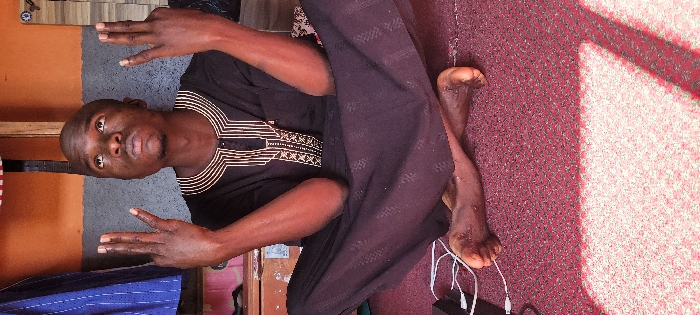 An adult male with dark complexion and a bald head is seated cross-legged on a red patterned rug or carpet in an indoor setting in Bukuru, Nigeria