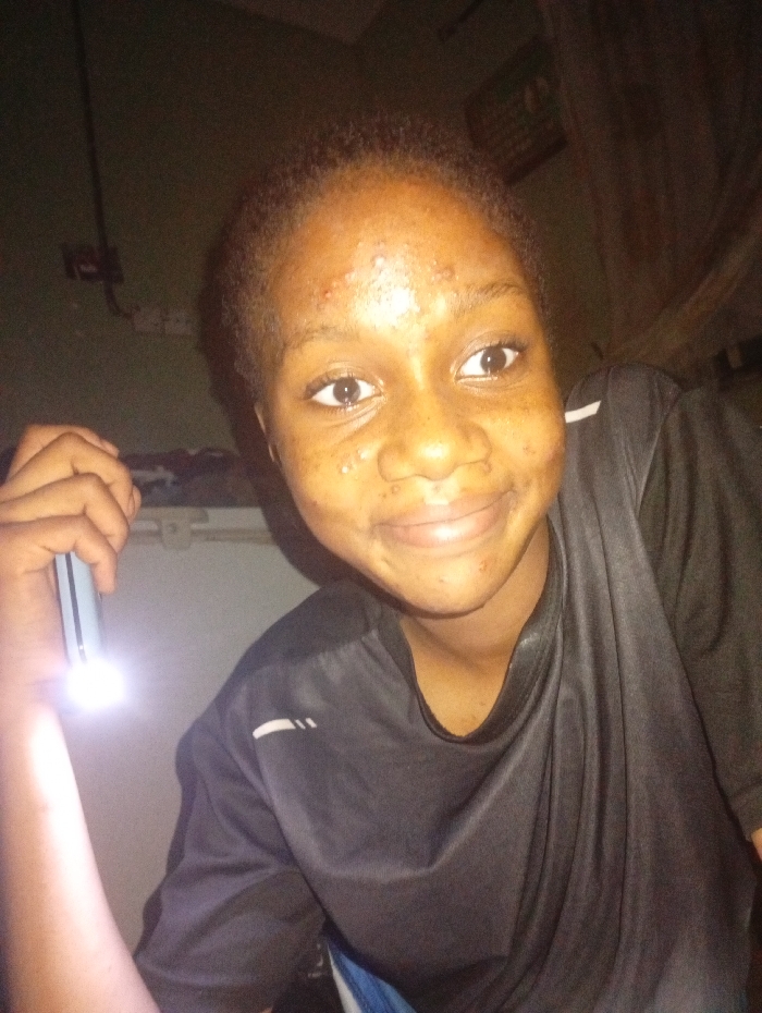 A young woman smiles while holding a lit flashlight close to her face. She has short hair and is wearing a dark athletic shirt with white stripes on the sleeves. Her skin has some blemishes. In the background, a wall is visible with a light switch and a picture hanging on it. Drapes hang on the right side of the image. The lighting is dim except for the brightness from the flashlight.