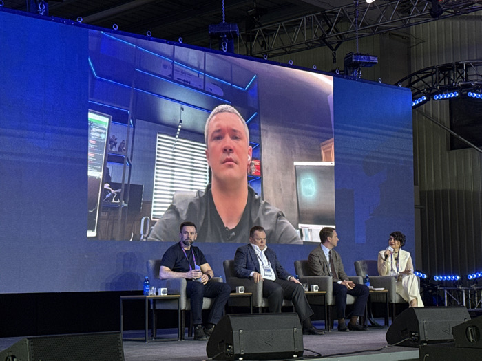 panel discussion taking place on a stage in Bila Tserkva, Ukraine. The stage is lit with spotlights and features a large blue screen displaying a video call. Four people are seated on chairs facing the audience. A man in a black shirt is seated on the left side of the screen. In the video call, a man with short gray hair and a beard is wearing a black shirt and looking at the camera. The man on the right side of the image is wearing a white suit and speaking into a microphone. The two other panelists are wearing suits and are sitting to the right of the speaking panelist. The image is taken from the audience's perspective. The speakers and the audience are not visible. There are two black speakers stacked to the right of the panel. There are lights on the left and right of the panel. The image is taken in a large hall with a gray ceiling and a black stage. The video call is a close-up of the man's face and torso. The background of the video call is a room with a window and a computer monitor. The image was taken in a conference hall.