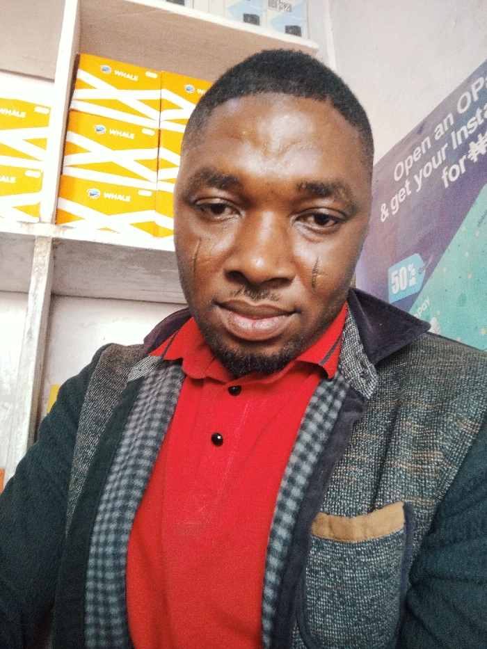 The image captures an adult male in an indoor commercial environment in Fagge A, Nigeria