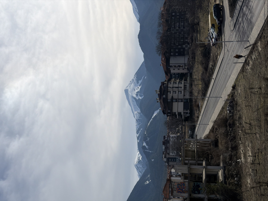 The image presents an elevated, wide-angle view of a populated area in Bansko, Bulgaria, set against a backdrop of snow-capped mountains. The sky is overcast with diffuse, bright clouds occupying the upper two-thirds of the frame. In the background, the Pirin Mountains dominate the horizon, featuring multiple peaks covered with snow. Visible on the snow-covered slopes are ski runs and forested areas on the lower mountain flanks. The midground features a cluster of multi-story buildings with varied architectural styles. To the left, an unfinished concrete building frame, approximately three stories high, shows exposed rebar and graffiti on some surfaces. Adjacent to it and further right are completed multi-story structures, some with dark brown roofs and multiple windows, appearing to be residential or hotel complexes. Sparse, bare deciduous trees are interspersed among the buildings and in the foreground. A paved two-lane road, flanked by light poles, runs diagonally from the lower left towards the mid-right. Parallel to the road on its right side is a paved sidewalk. In the lower right quadrant, a single individual, dressed in dark trousers and a lighter-colored top, is observed walking away from the camera on this sidewalk. Further right, off the main road, a small parking area contains several parked vehicles, including a yellow van and multiple passenger cars (white, silver, black). The immediate foreground consists of a relatively barren, uncultivated field with dry, light brown vegetation and rows of small saplings or stakes.