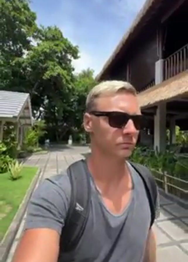 A man with short blonde hair and sunglasses walks along a stone pathway at a tropical resort. He wears a gray T-shirt and a black backpack. To his right is a two-story building with a thatched roof and dark wood siding. The pathway is lined with grass and tropical plants. A golf cart and a person pushing a trolley pass by. The sky is blue with some clouds. The man appears to be filming himself as he walks.