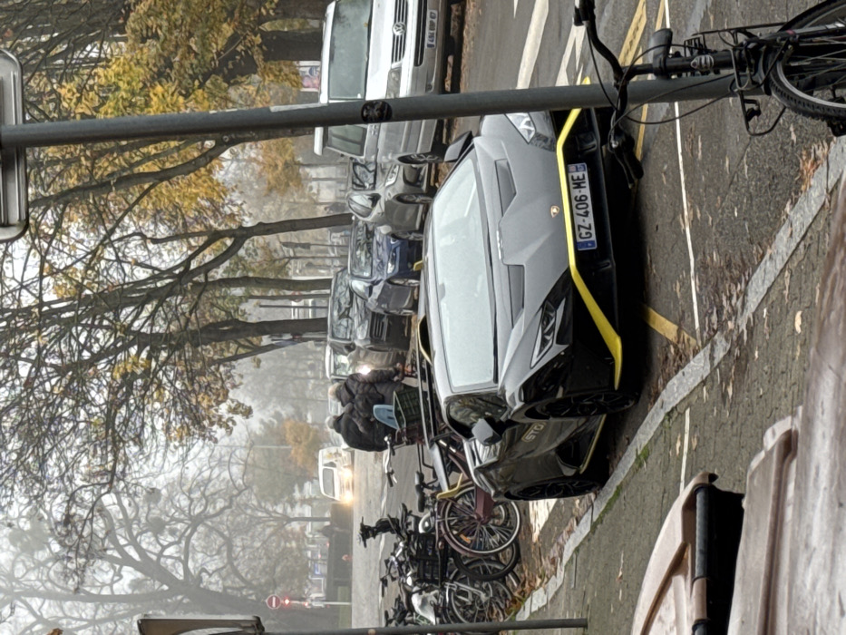 A black Lamborghini Huracán STO, distinguished by yellow accents on its front bumper and side skirts, is parked on a city street in Strasbourg, France. The vehicle displays French license plate GZ-406-ME and is positioned with its right wheels on a curb, partially over yellow no-parking lines. The scene is overcast and misty, with bare trees showing sparse yellow autumn foliage lining the street; the pavement appears damp. In the mid-ground, a small group of three individuals, bundled in heavy coats, are visible near parked vehicles. One person is associated with a bicycle equipped with a front basket and a child seat. To the left of the Lamborghini, multiple bicycles are secured to a bike rack on the sidewalk. A line of other vehicles, including a dark SUV, a blue sedan, a silver hatchback, and a white Volkswagen Transporter van (license plate F-494-BP), are visible parked along the right side of the road and in a traffic queue further back. In the distant background, a white delivery van with illuminated headlights approaches an intersection where a red traffic light is visible. In the immediate foreground, two brown refuse bins are present on the left, and a grey metallic pole partially obscures the right side of the image.